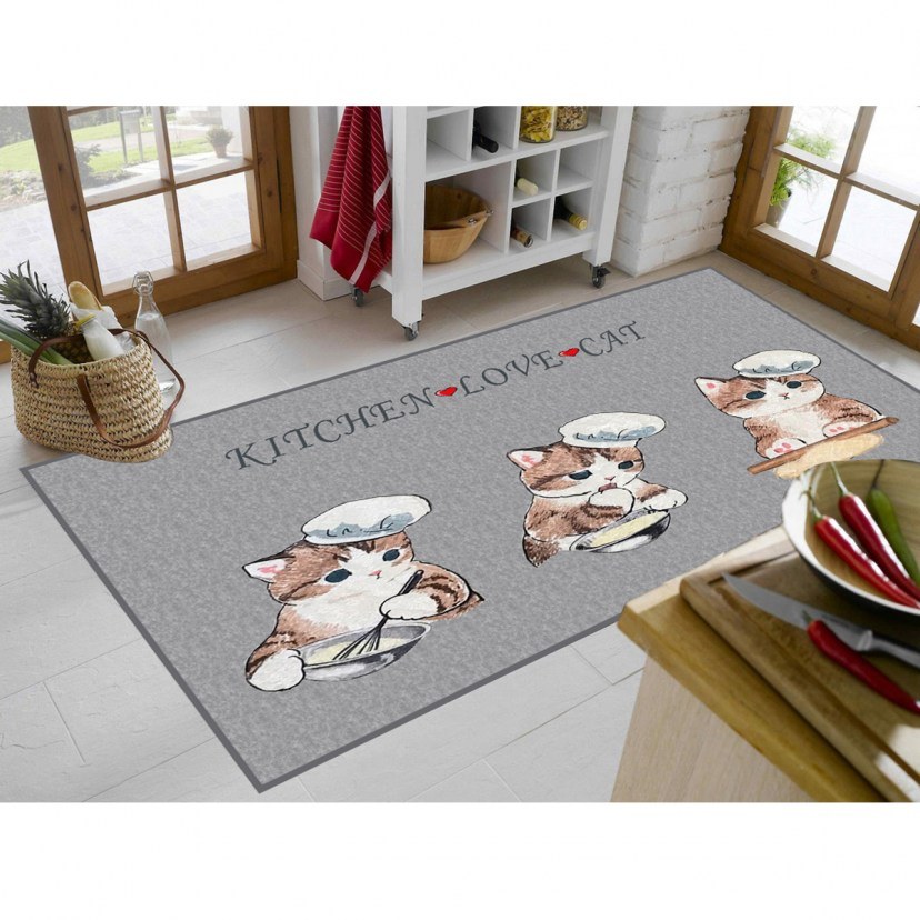 To Χαλάκι Κουζίνας Kitten 264 διαθέτει αγαπησιάρικο σχέδιο, το οποίο αναπαριστά χαριτωμένα γατάκια με σκούφους του σεφ να μαγειρεύουν, γεγονός που το καθιστά εξαίσια επιλογή για την κουζίνα σας. Είναι κατασκευασμένο από πολυεστερικά νήματα που το καθιστούν ανθεκτικό στο χρόνο και στη χρήση και διαθέτει βάση με αντιολισθητική επίστρωση dots backing, που το καθιστά ασφαλές και σταθερό.
