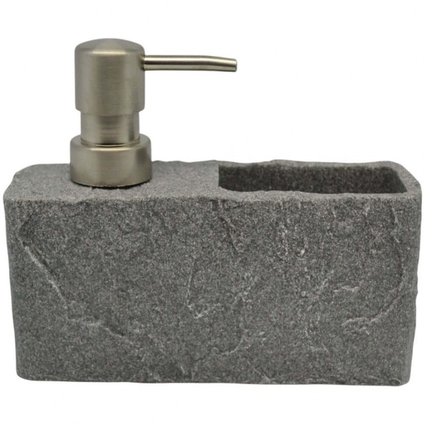 Το Δοχείο Κρεμοσάπουνου με Θήκη συνδυάζει κομψότητα και λειτουργικότητα. Κατασκευασμένο από ανθεκτικό πολυεστερικό υλικό με φυσική υφή πέτρας, διαθέτει ενσωματωμένη θήκη για την αποθήκευση μικρών αντικειμένων και πρακτική αντλία για εύκολη χρήση του υγρού σαπουνιού, κάνοντας το ιδανικό για ένα οργανωμένο και στιλάτο μπάνιο.
