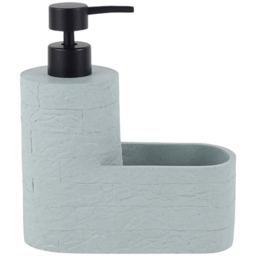 Το Δοχείο Κρεμοσάπουνου με Θήκη συνδυάζει στιλ και λειτουργικότητα, με κατασκευή από ανθεκτικό πολυεστερικό υλικό και φυσική υφή πέτρας. Διαθέτει ενσωματωμένη θήκη για σφουγγάρι ή μικρά αντικείμενα και αντλία με ματ φινίρισμα, προσφέροντας μοντέρνα αισθητική και πρακτικότητα για το μπάνιο σας.