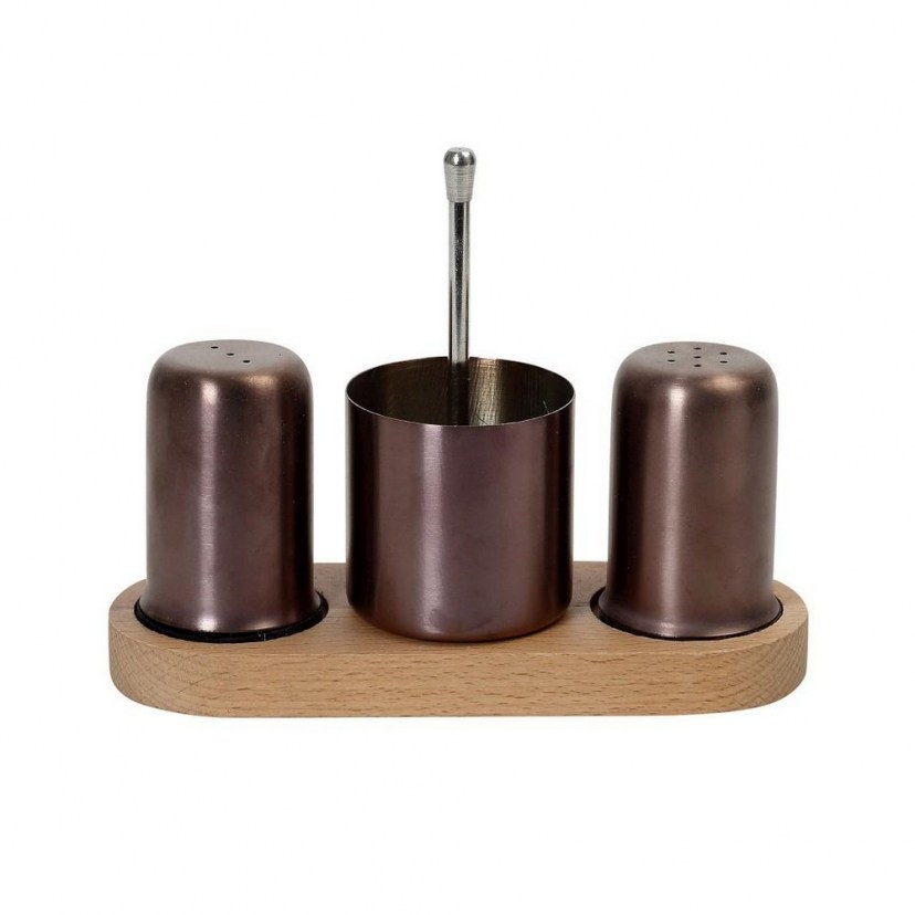 Discover the Salt and Pepper Set With Toothpick Case that will provide solutions to any business table and upgrade its aesthetics. Made from high-quality materials, this set combines durability and elegance, making it a must-have for any dining space. The salt, pepper and toothpick containers are made of 18/10 stainless steel, which is suitable for food contact. This material is known for its corrosion resistance and durability in everyday use. The PVD coating offers increased wear resistance and lends a sophisticated shine to the containers. The modern and industrial design of the set makes it ideal for spaces with contemporary decor. The base of the set is made of natural-toned beech wood, offering a warm and natural feel that perfectly complements the metallic elements. Quality: