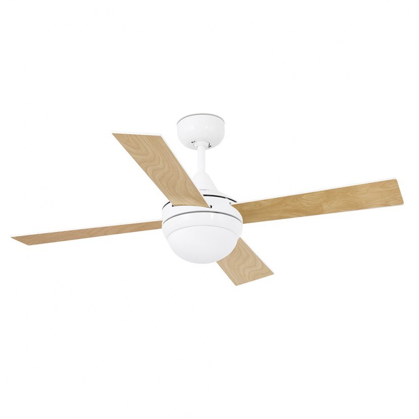 R9IV08N The Mini Icaria 33695 Ceiling Fan is ideal for spaces smaller than 13 m² and can be installed even on sloping ceilings. It has a steel frame and reversible MDF blades with a different color on each side. In the center, it has a glass diffuser that allows the light to be evenly and abundantly distributed in your space. It requires two E14 MAX 8W bulbs, which are not included in the package. It operates with a remote control and has three operating speeds with a consumption of 16-24-35 W and 135-175-210 revolutions per minute in each mode. It also has a reverse function (summer - winter), which will enhance the performance of your heating, as the fan recirculates the warm air near the ceiling and redistributes it in the environment, saving heating consumption. During the summer, the ceiling fan lowers the temperature, creating a pleasant breeze. If used in combination with air conditioning, the fan can save up to 40% of consumption. Technical Specifications:
