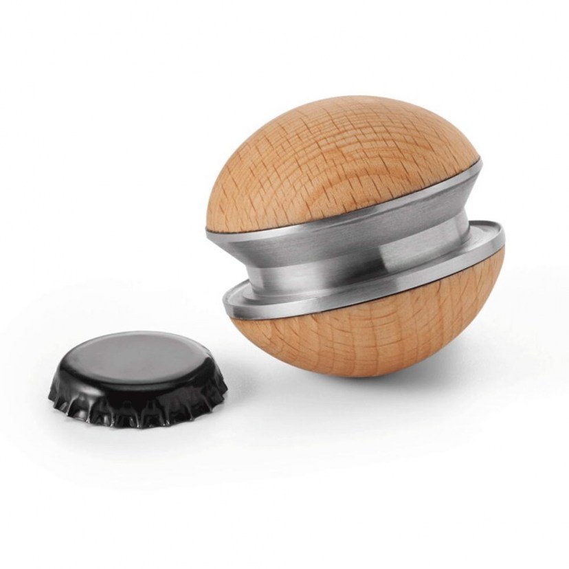 Have you ever wondered what might be hiding behind the Boule 353017 Bottle Opener? It is a bottle opener that adds a dose of mystery and fun to every social gathering. Boule is a playful bottle opener that will leave no one indifferent. Your guests will try to guess how it works while enjoying their drink. With a relaxed hand movement, Boule removes the cap from the bottle, while the oak wood is comfortable to hold. The stainless steel ring releases the cap with surprisingly little effort. From now on, the motto at the table is simple: "Roll it!" Boule is much more than a bottle opener - it is a dose of playful fun that will make your moments even more memorable. Quality: Oak Wood & Stainless Steel Dimensions: 1 Opener: Diameter: 5 cm