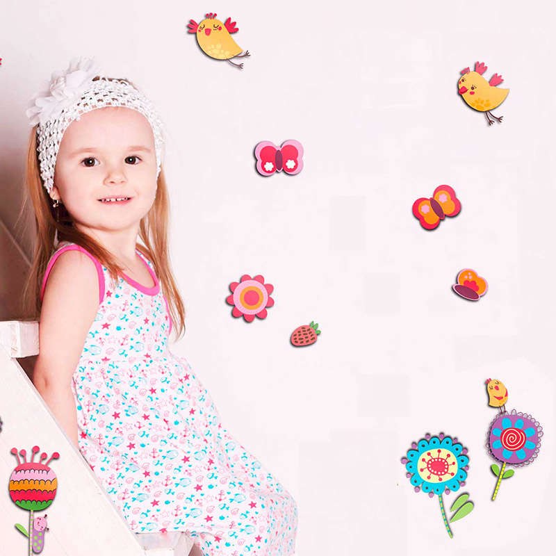 Flowers, birds, butterflies and strawberries, the Birds & Flowers 14501 3-Level Wall Stickers have everything you need to decorate your child's room. Your little girl will be thrilled with the cheerful colors and designs that will adorn the walls of her personal space. They are made of colorful, non-toxic, foam rubber and vinyl. They are easy to place and clean, and can be removed and repositioned quickly and easily without damaging the wall or stickers.