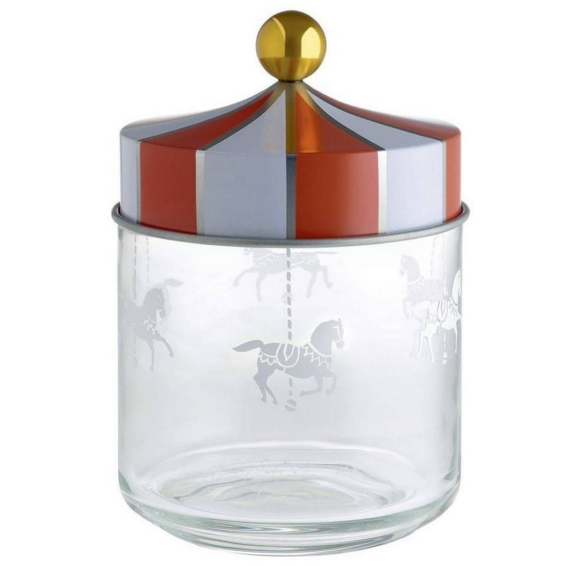 Circus MW30/75 storage jar has a fashionable lid with hermetic closure so that it can be used to store different types of food, locking all the freshness, fragrance and their taste. For this object, Marcel Wanders imagines a decoration reminiscent of the cheerful carousels and the awning that is often set up with the big circuses. The lid is decorated with the traditional red and white awning strips, while the golden detail is a glittering ornamental touch that takes off the aesthetic effect! Capacity: 750 ml. Washed in the dishwasher. quality: