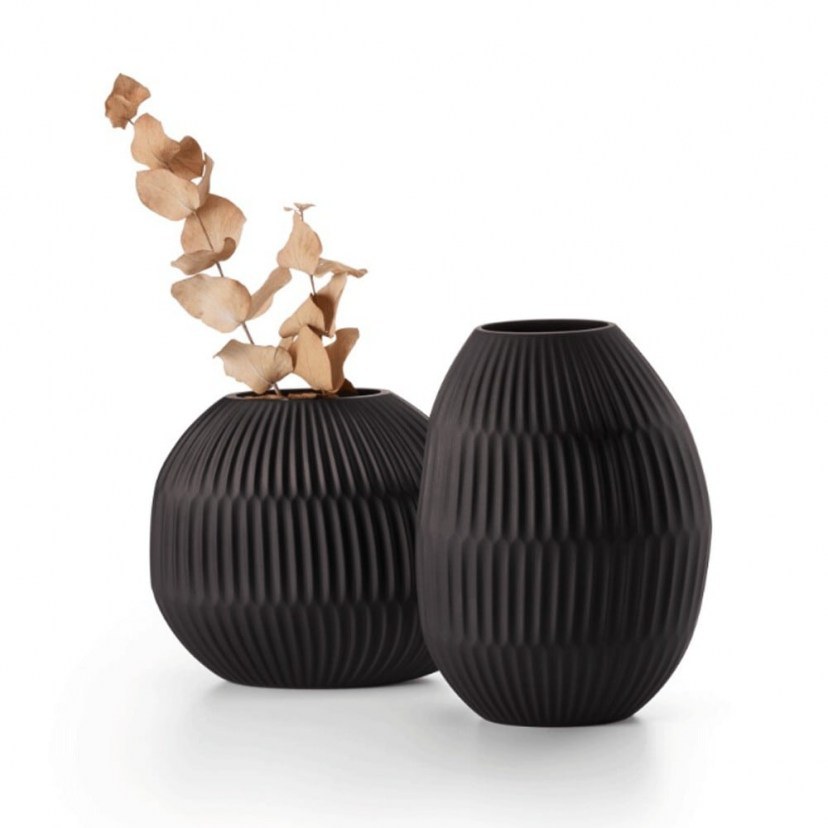 The Noir Tall Vase 166019 stands out for its asymmetric and artistic appearance, which is purposeful and exudes creative freedom, away from standard monotony. Its unique pleated appearance, highlighted by the play of light on the surface, offers an impressive visual experience that impresses from every angle. The vases are made of glass with exquisite craftsmanship, blown and designed by hand, coated with a matte finish, which creates a striking contrast with the flowers placed inside. The thick and fine texture of the vase creates a feast for the eyes, and the real magic comes when the vases are combined in pairs, revealing the purest aesthetic delight.