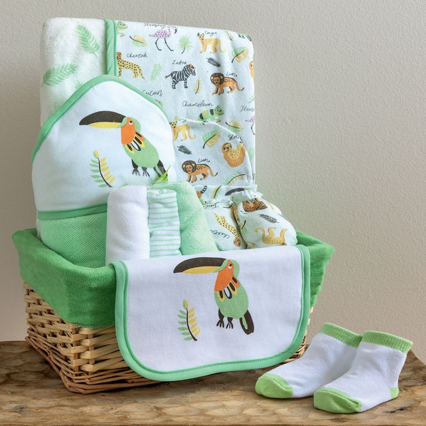 The Baby Gift Basket Set NB0149 (11pcs) was designed to offer a newborn baby many of the essential items of his daily life. It has cute designs with animals, which will make the baby crazy. The set includes a fleece blanket, a hooded towel, a washcloth, a bib, three washcloths, a cap, a pair of mittens and a pair of socks. All this comes in a beautiful basket.