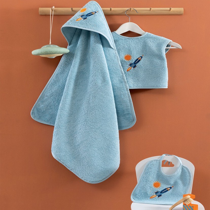 Για εσάς που ψάχνετε τα καλύτερα για το παιδί σας, το Σετ Βρεφικό Σετ Μπάνιου BJ569 (3τμχ) είναι μία καταπληκτική επιλογή. Το σετ περιλαμβάνει ζιπουνάκι, σαλιάρα και κάπα, όλα με κεντημένο σχέδιο διαστημόπλοια και ήλιους. Με βάρος 380gsm, η πετσέτα είναι εξαιρετικά απαλή και απορροφητική, ιδανική για τη βρεφική επιδερμίδα. Πλένεται στους 40°C και σιδερώνεται σε μέτρια θερμοκρασία. Απαγορεύεται το στεγνωτήριο, το στεγνό καθάρισμα και η χρήση ισχυρού λευκαντικού ή χλωρίου.