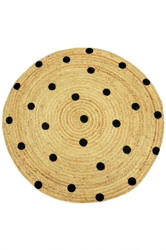 The Delhi Rug BR-ME004 is a modern decorative addition to your space! It is a beautiful handmade rug, made of jute in a natural shade with polka dot details in black color, which give it an even more beautiful appearance. It is a decorative rug that can be easily cleaned with a vacuum cleaner without brushes. It is sensitive to use and cleaning, thanks to the natural construction material.