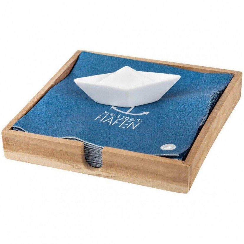 The Boat LBTRD0012960 Napkin Holder is made of untreated acacia wood and features a porcelain boat to keep the napkins organized. Make it yours and you will love it, as it will upgrade the decoration on your table. Quality: Acacia & Porcelain Dimensions: 1 Napkin Holder: Length: 18 cm, Width: 18 cm