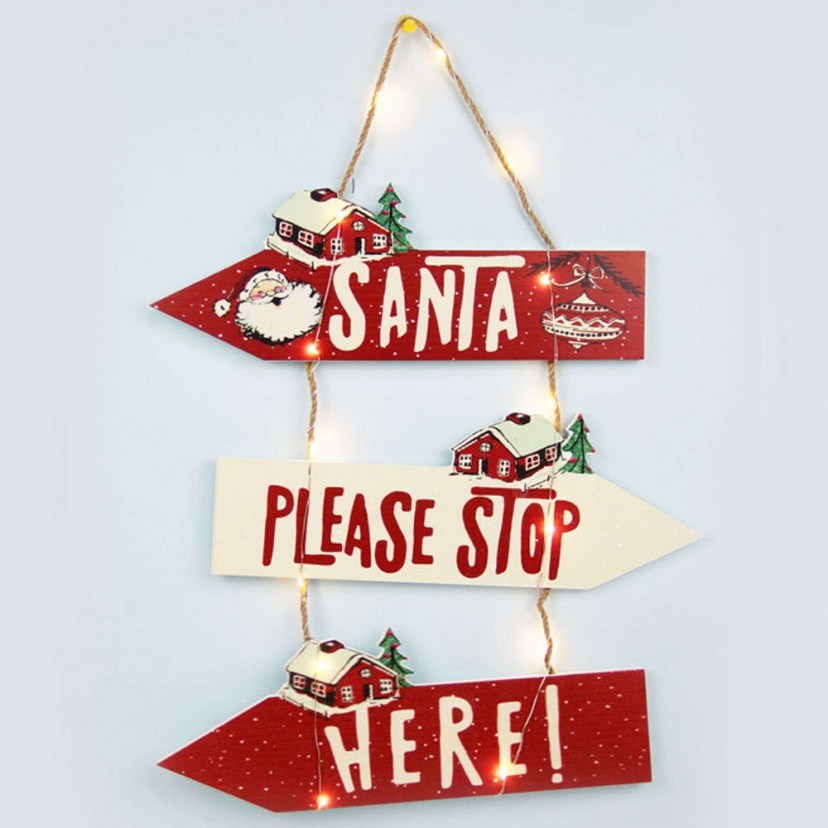 The Christmas Decorative Hanging Santa Signpost Led X05141115 is a beautiful and affordable choice for those who want to add sparkle and elegance to their holiday decoration. It consists of wooden signs with a message for Santa Claus. It has 14 LED lights with warm white light. It operates with two AAA batteries, which are not included.