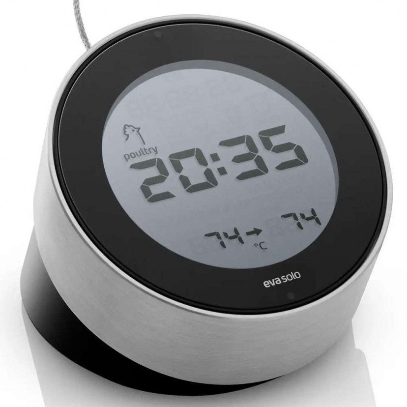 The Cook 'N Time 567763 Kitchen Digital Timer - Thermometer is an all-in-one cooking thermometer with a sensor, timer, and digital clock. The thermometer can be hung on the oven door and is easy to use. The Danish National Cooking Team recommended pre-programmed temperatures for four types of red meat and poultry, as well as the melting temperature for chocolate. The cooking thermometer displays the selected setting, the actual temperature of the sensor, and the target temperature, and beeps when the desired temperature is reached. The current time is constantly displayed, while the timer can be easily set using the rotating disc to sound as soon as the required time has elapsed. It includes instructions for use as well as recommended cooking temperatures and resting times.