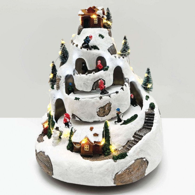 The Decorative Village with Motion & Music X0331 features lights, houses, figurines, trees, and moving skiers. It plays festive music with 8 different melodies. It has 38 LED lights with RGB warm white lighting. It operates with electricity, but also with 3 AA batteries, which are not included in the package.