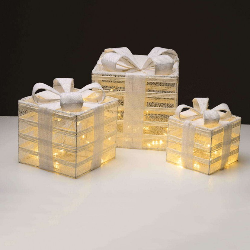 The Decorative Gift Box Set With Led Lighting X11751115 will perfectly decorate the area under the tree as well as another corner in your space. It consists of three decorative boxes of different sizes, which are illuminated, shiny, and beautiful. They have warm white light with a total power of 2.25W and each one operates with three AA/LR6 1.5V batteries, which are not included in the package. The lighting is steady and has an On/Off switch. Features: Power: 0.45W & 0.75W & 1.05W Light Color: Warm White Number of bulbs: 75 mini leds Specifications for 1 led bulb: 3V/ 15mA/ 0.03W Degree of waterproofness: IP20 Dimensions: 17x15x15 cm & 23x20x20 cm & 28.5x25x25 cm