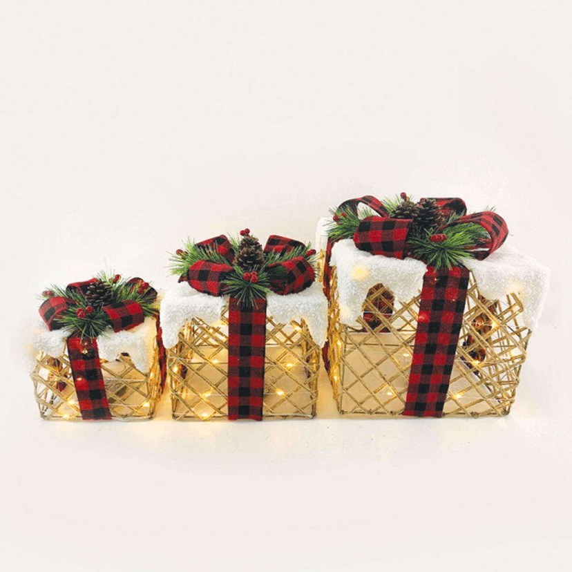 The Decorative Gift Box Set With Led Lighting X1190111 is an impressive decorative touch that will make the atmosphere of your home more beautiful and festive than ever! It consists of three decorative boxes of different sizes, which are illuminated and decorated with plaid ribbon, artificial snow, and artificial pine cones and pine needles. They have warm white light with a total power of 4.05W and each one operates with three AA/LR6 1.5V batteries, which are not included in the package. Their lighting is steady and they have an On/Off switch.