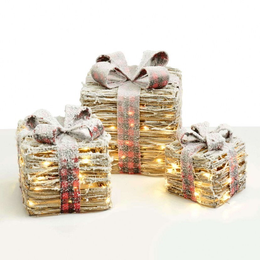 The Decorative Gift Box Set With Led Lighting X1190112 is an impressive decorative touch that will make the atmosphere of your home more beautiful and festive than ever! It consists of three decorative boxes of different sizes, made of rattan and decorated with artificial snow and ribbon. They have warm white light with a total power of 4.5W and each one operates with three AA/LR6 1.5V batteries, which are not included in the package. The lighting is steady and has an On/Off switch. Features: Power: 0.9W & 1.35W & 1.8W Light Color: Warm White Number of bulbs: 90 mini leds Specifications for 1 led bulb: 3V/ 10mA/ 0.045W Waterproof rating: IP20 Dimensions: 17x17x18 cm & 22.5x22.5x24 cm & 27.5x27.5x30 cm