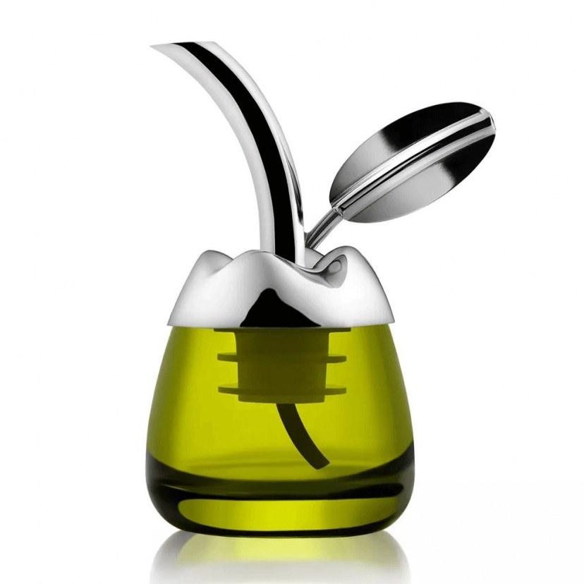 The Cactus MSA32 Flowing Oil Container, designed by designer Marta Sansoni for Alessi in 2014, is more than just an oil bottle. The polished stainless steel spout offers a great solution that allows the oil to flow easily in the right amount. The integrated shut-off valve in the mouth ensures that the bottle is sealed airtight, controlling the oxidation process of the oil. When you place the spout in the small accompanying glass bottle, you not only have a cute little bottle of oil on the table, but a classic tasting bottle to taste and evaluate the olive oil. The glass bottle tapers so that the aroma of the oil is directed directly to the taster's nose. In addition, the dark green glass prevents the tester from seeing the color of the oil and possibly being affected during the test or the light altering the taste of the oil. A design with a story behind it that will undoubtedly surprise many cooking enthusiasts as a great gift or addition to their kitchen. Quality: