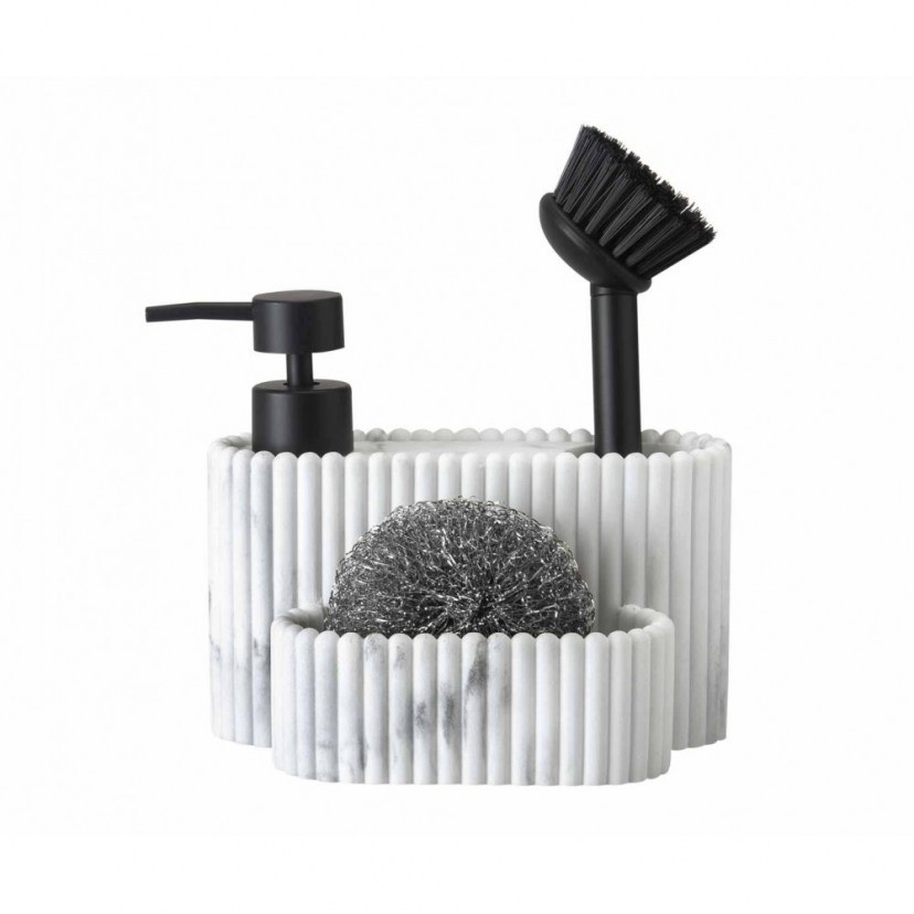 The 3 In 1 Stripes AH-CC74067 Liquid Dish Container stands out for its practical and stylish design. It is made of durable polyresin and ABS and features an impressive embossed design and marble effect. It has pockets for the sponge and the cleaning brush, which are included. Clean with a fresh cloth, without using abrasive products.