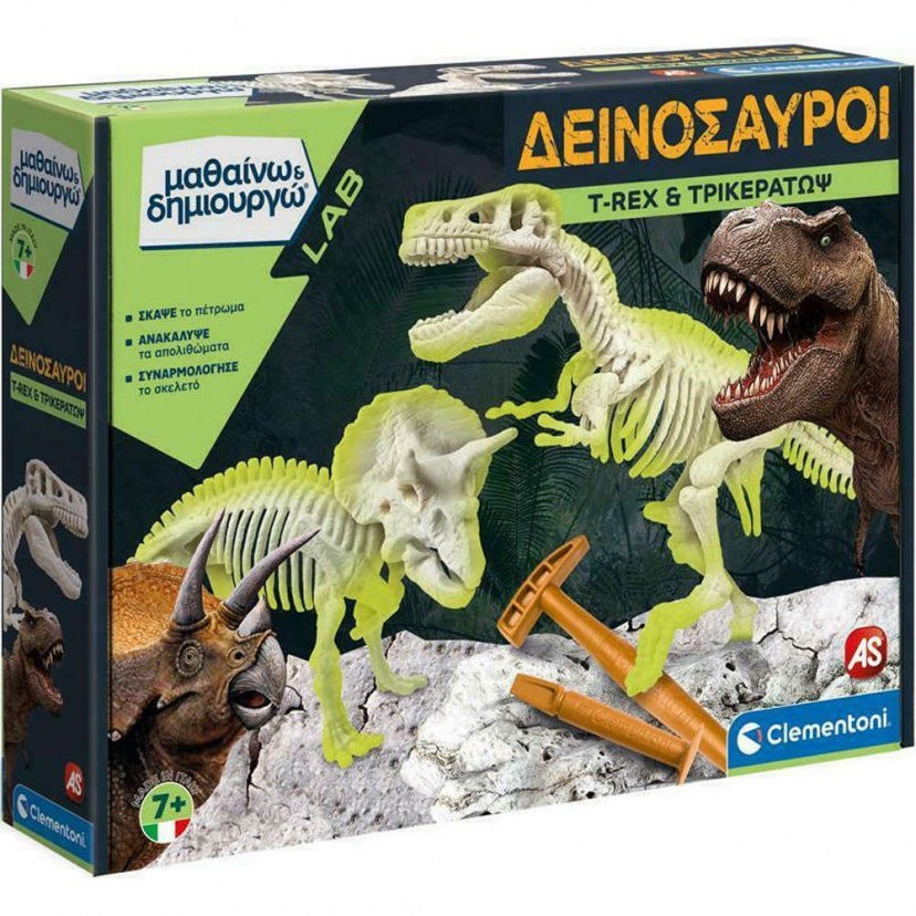 Explore the enchanting world of dinosaurs with the Educational Game Learn & Create T-Rex & Triceratops 1026-63403! It includes the tools of a real paleontologist - a hammer and a chisel - with which your child can excavate and discover the ancient fossils of two fearsome dinosaurs: the Tyrannosaurus and the Triceratops. Then, as a great scientist, they can assemble their skeletons and enjoy them as they glow impressively even in the dark! But this is not just a simple creative activity. By downloading the free app and scanning the cards, you will see the dinosaurs come to life through augmented reality! The app is compatible with Android TM and Apple. The game package includes fossils, stones for excavation, dinosaur cards, hammer, chisel, and an illustrated manual with all the detailed information. Additionally, you will find a map of the Mesozoic Era and step-by-step instructions for assembling the skeletons. Allow the little paleontologists to experience an exciting learning experience with this smart educational game!