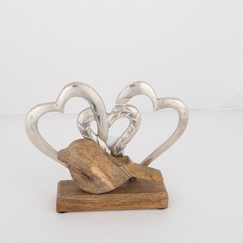 With the Hearts And Wooden Bird Table Decoration 752-28562 you will create the sweet and romantic atmosphere you desire. It features three hearts and a bird, made of metal and wood. The construction materials combine harmoniously and create a wonderful whole.