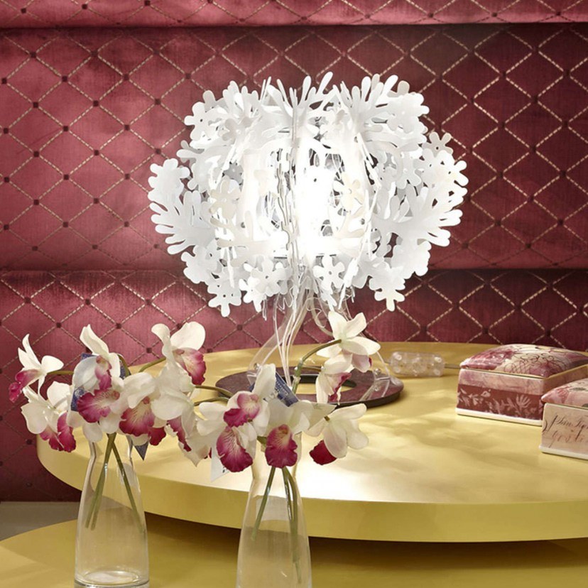 Provocative, realistic and welcoming. The natural details of the Fiorellina series, designed by Nigel Coates, create a world covered in flora. The expressive power of the lighting, combined with the bright petals, transforms and enchants with the fantastic shadows that flow onto the walls. It has an E14 MAX 5W bulb which is not included. Quality: Cristalflex / Steelflex / Copperflex. Available dimensions: 1 table lamp Diameter: 33cm Height: 34cm.