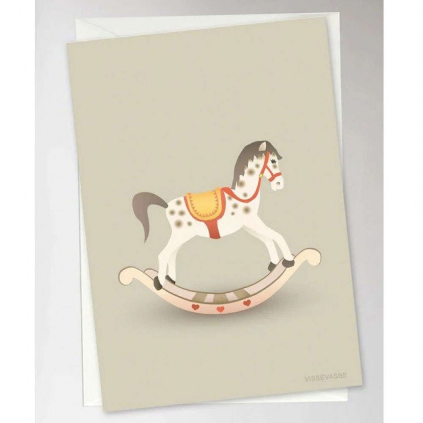 The Rocking Horse VVF2017215XS Greeting Card was designed to help you convey beautiful wishes to a child or a family that has brought a baby into the world. It features a cute rocking horse design. The card is printed in Denmark on 350gr silk matte paper and the C6 envelope is Multi Design. It is a product certified with FSC®. By choosing products with FSC labeling, you contribute to the protection of forests. It is offered at a special price. Quality: Paper Dimensions: 1 Greeting Card: Length: 10.5 cm, Width: 15 cm