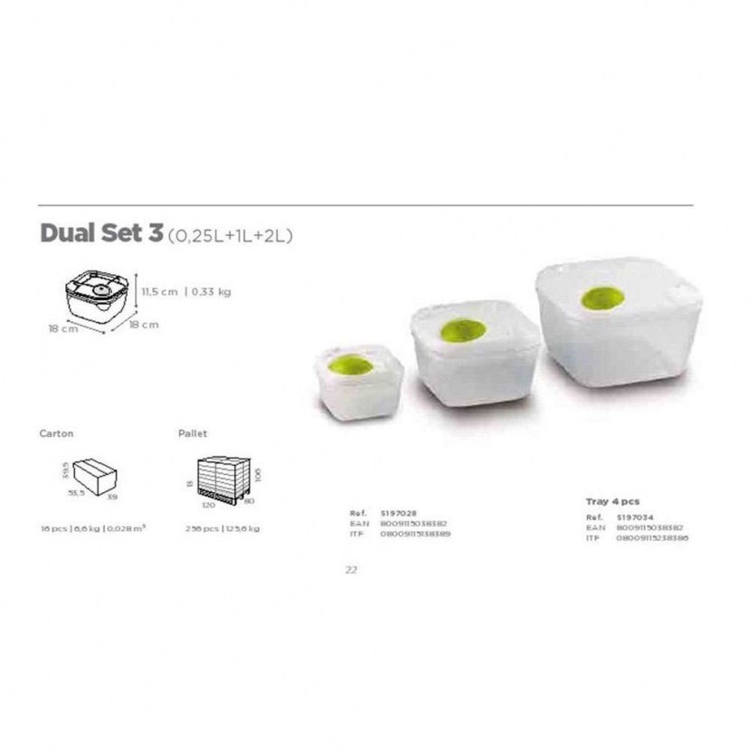 Το Σετ Φαγητοδοχεία Dual Tris GS05197034 αποτελείται από 3 πλαστικά φαγητοδοχεία σε 3 διαφορετικά μεγέθη. Είναι αρκετά πρακτικά και ελαφριά για να τα μεταφέρετε παντού μαζί σας. Το σχήμα τους είναι τετράγωνο και κλείνουν αεροστεγώς για να διατηρηθούν τα τρόφιμα αναλλοίωτα.
