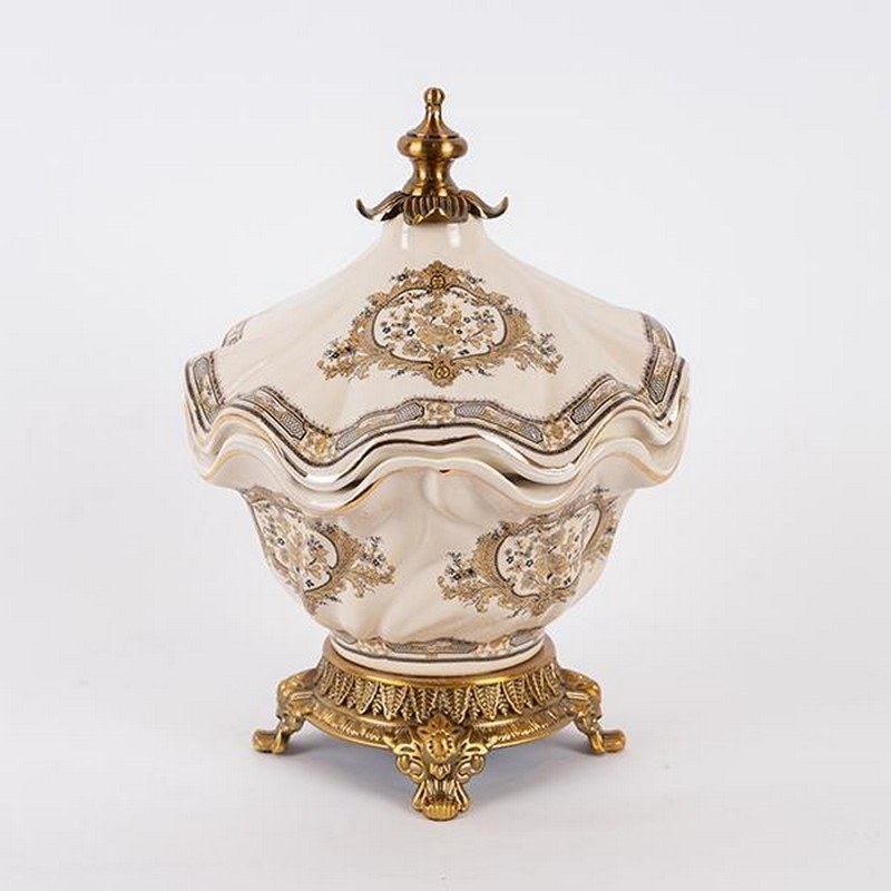 The Fountain 752-21027 is made of fine porcelain and impresses with its elaborate design and antique finish, which is distinguished by its embossed base and handle. Its lid adds an extra touch of elegance, making it ideal for hosting and preserving your favorite confections in style. The wavy design on its lip makes it an aesthetic masterpiece that will captivate the eyes.