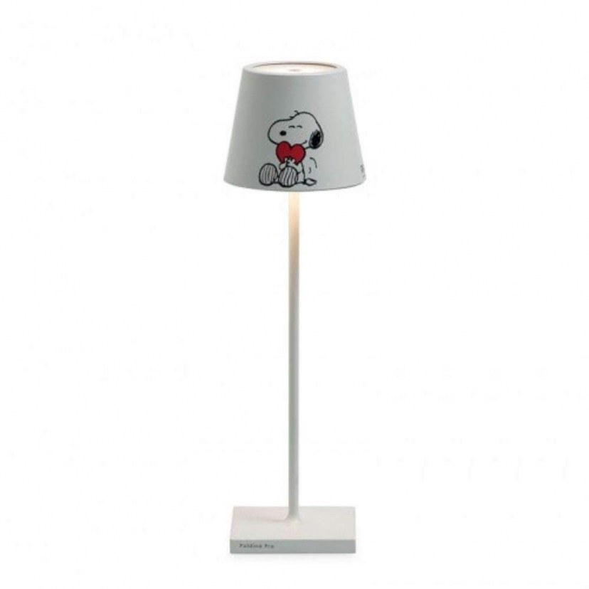 The Rechargeable Led Table Lamp Poldina x Peanuts Heart LD0340BP2 brings to life the famous Peanuts comic created by Charles Schulz in 1950. The modern lamp is made of aluminum with a polyacrylic diffuser and features the adorable Snoopy hugging a red heart. It is a handmade lamp, manufactured in Italy. It has an adjustable LED light source of 2.2W with warm light (2700-3000K) and a brightness output of 192-200 lumens. It is rechargeable with a maximum autonomy of 9 hours and a full charging time of approximately 6 hours. It includes a charging base and a USB cable. It is ideal for use in indoor and outdoor spaces, as it is waterproof with an IP65 waterproof rating.