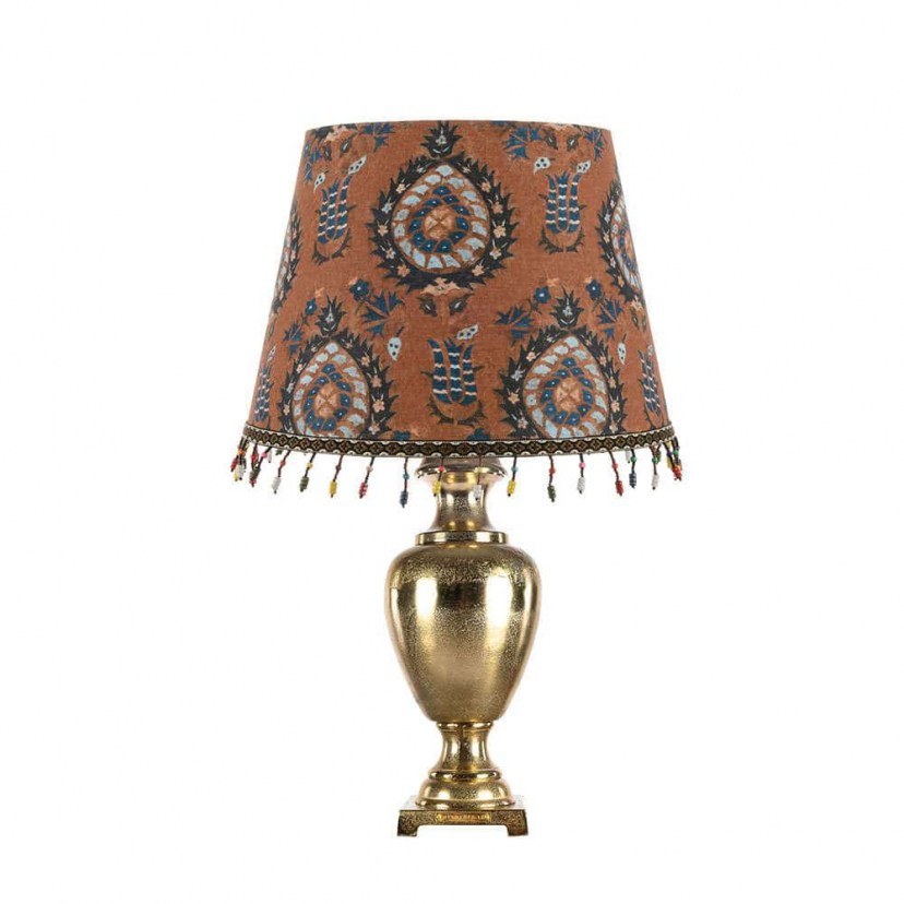 A refined aristocratic design of a Roman imperial vase transformed into this unique table lamp! The Flourish-Ulpia Table Lamp is made of cast aluminum and finished with antique brass. It features a fabric shade, which is decorated with printed floral designs and colorful beads. It requires one E27 bulb, which is not included in the package. It comes with a 2-meter cable. The product is imported exclusively for you from abroad, so there may be delays in delivery time. Quality: Fabric & Metal. Dimensions: 1 Lamp: Base: Diameter: 18 cm, Height: 52 cm & Shade: Diameter: 35-45 cm, Height: 30 cm.