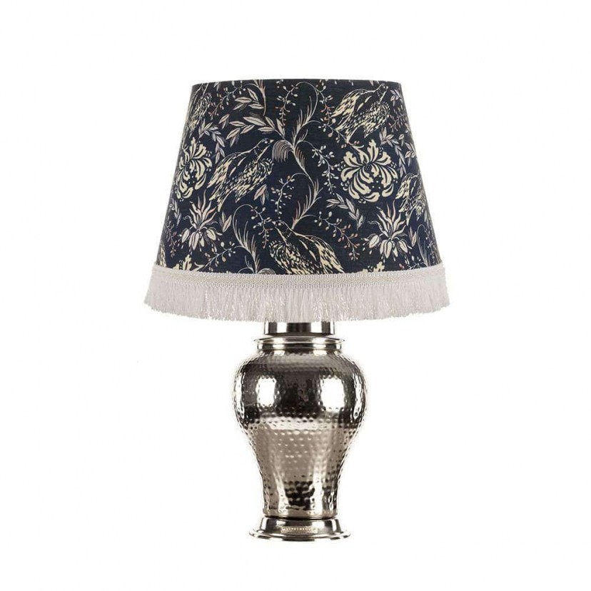 The soft blue of Hungarian roots combines with the elegant light-colored floral pattern to create the beautiful Folk Tale-Empire Table Lamp. It is decorated with rich tassels at the end, which enhance the aesthetic result. It has a hammered metal base with antique design. It requires an E27 bulb, which is not included in the package. It comes with a 2-meter cable. The product is imported exclusively for you from abroad, so there may be delays in delivery time. Quality: Metal & Fabric. Dimensions: 1 Lamp: Base: Diameter: 20 cm, Height: 54 cm & Shade: Diameter: 35-45 cm, Height: 30 cm.