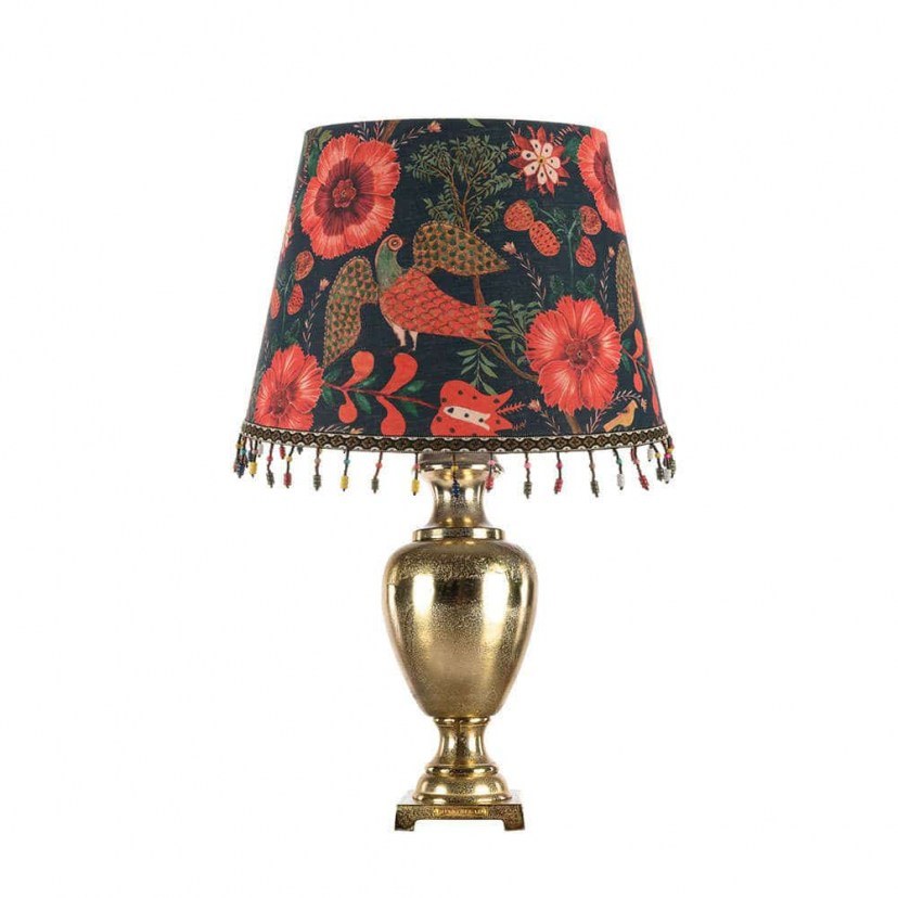 An exquisite aristocratic design of a Roman imperial vase transformed into this unique table lamp! The Szekely-Ulpia Table Lamp is made of cast aluminum and finished with antique brass. It features a printed linen cone shade adorned with colorful beads. The colors "bloom" in this unique image, thanks to the large, bold flowers and striking birds that stand out. It requires an E27 bulb, which is not included in the package. It comes with a 2-meter cable. The product is imported exclusively for you from abroad, so there may be delays in delivery time. Quality: Aluminum & Fabric. Dimensions: 1 Lamp: Base: Diameter: 18 cm, Height: 52 cm & Shade: Diameter: 35-45 cm, Height: 30 cm.