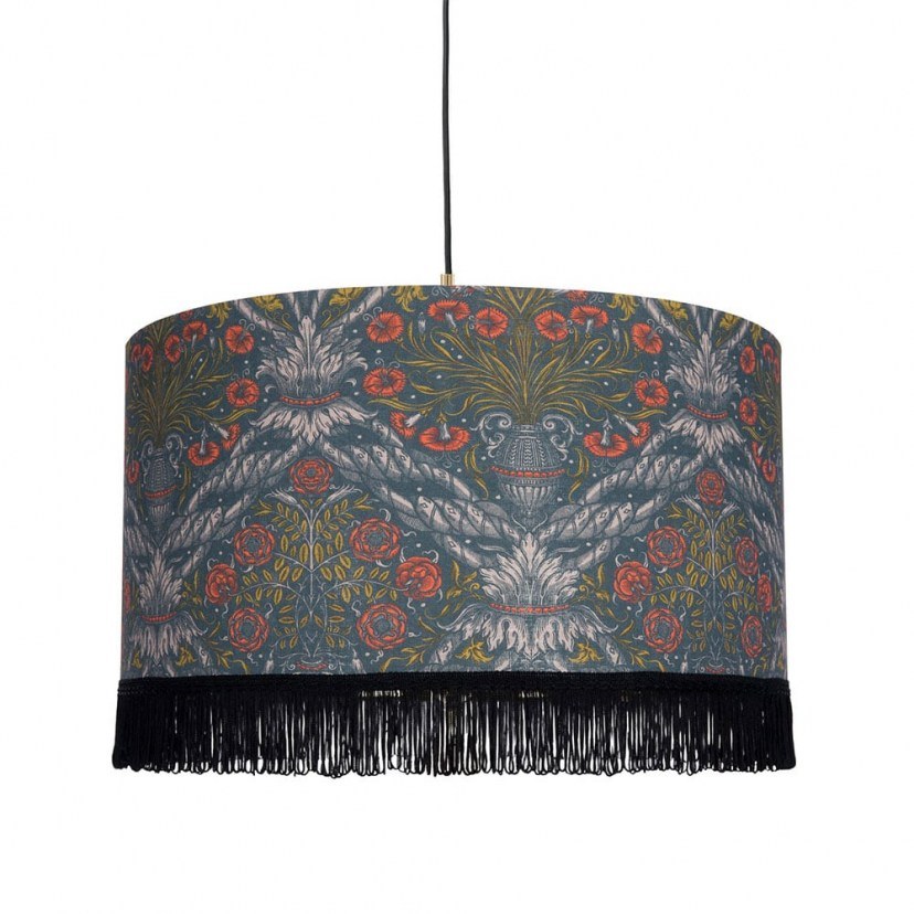 A flowery pattern inspired by a colorful, wooden Dutch antique showing beautiful roses and carnations combined with woven link chains. The Decorative Panel CL50241 Ceiling Light features an impressive cap and metallic details with a gold finish. The aesthetic result is enhanced by the fringes it carries around. An E27 MAX 60W bulb is required, which is not included in the package. It has a 2m long cable. Quality: Fabric & Metal. Dimensions: 1 Light: Diameter: 45 cm, Height: 28 cm.
