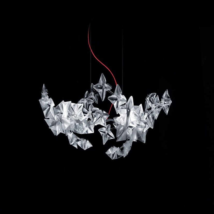 The Hanami Small Ceiling Light is a symbol of sensitive poetry, named after the traditional Japanese ceremony of observing blooming cherry blossoms. The Hanami family includes ethereal suspensions, available in two sizes, as well as a wall lamp version. The unique, softly colored lighting of Hanami is distributed in handmade flowers folded from Lentiflex®, a noble material that recreates diamond-shaped reflections, placed in a painted steel and polycarbonate frame that houses the LED sources. It has an integrated 27W LED light source with warm white light (2700K) and a luminous flux of 2500 Lumen. Quality: Lentiflex® / Polycarbonate / Stainless Steel. Dimensions: 1 Light: Length: 53 cm, Width: 35 cm, Height: 25-140 cm.