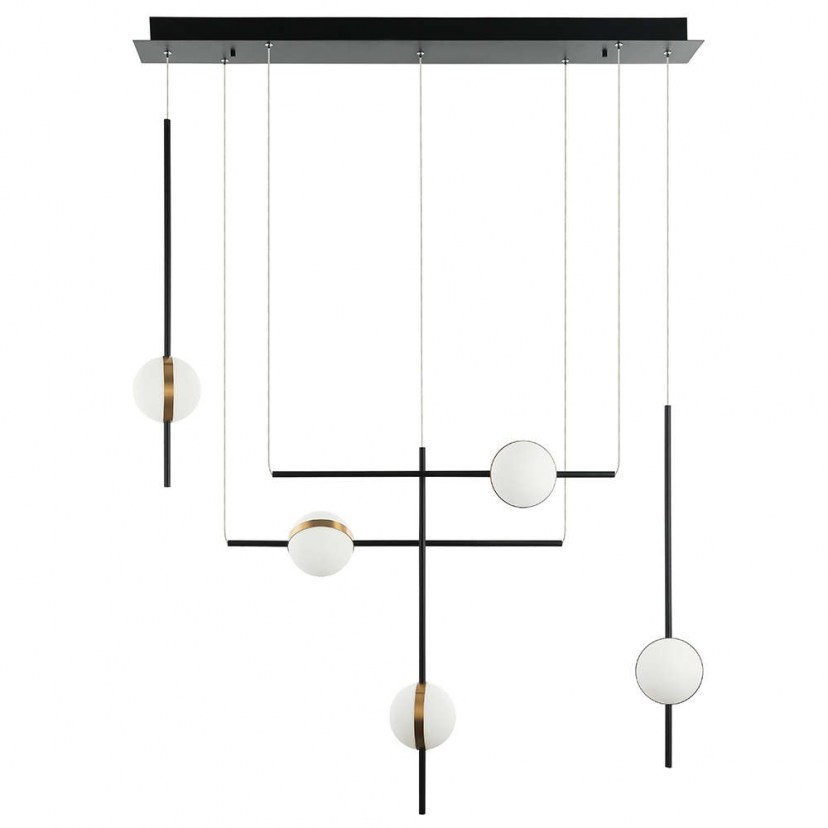 """ Modern geometric design lighting, which is ideal for your home or business! The Tube Ceiling Light 2001 features an impressive frame made of metal and aluminum, with gold details. It has five opaline balls, two of which are movable. It has integrated lighting of 38W with warm light (3000K) and a luminous flux of 3040 Lumen. It has an adjustable cable with a length of 150 cm. Quality: