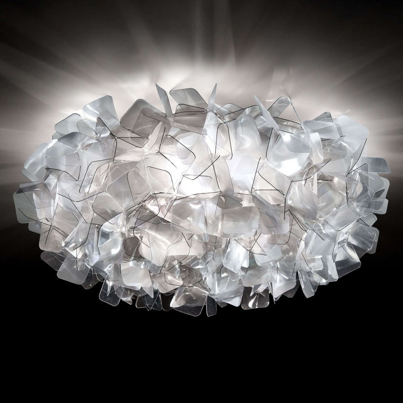 The Clizia Ceiling Light is a series of shapes that have come together to create a perfect balance of reflective surfaces. Designer Adriano Rachele envisioned a light that resembles a cloud capturing the first changing rays of the morning sun or a tree creating a play of light and shadows. Combine aesthetics with functionality - it features a magnetic anchoring system. Requires 3 E27 10W bulbs, not included. Quality: Opalflex®. Dimensions: 1 ceiling light diameter: 78cm, H: 25cm.