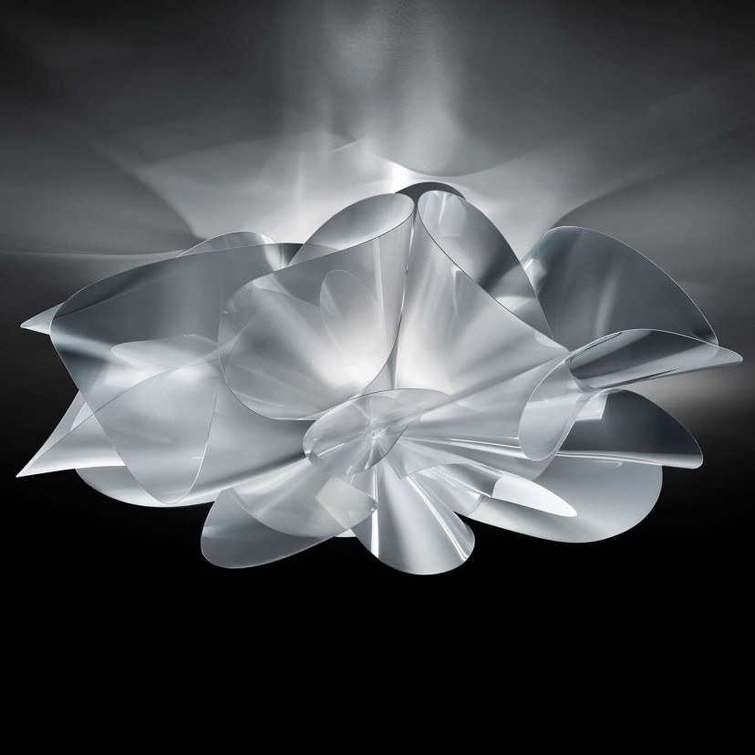 The New Etoile Ceiling Light takes its name and inspiration from the world of dance. The light's charming shapes take form thanks to the patented Lentiflex® technology. The biggest innovation of the light is the new LED MagneticSystem®, patented as the bulb can be easily replaced. The crystal droplet enriches the surface of the light and gives balance to the asymmetrical wings, just as Adriano Rachele desired. It requires a 15W LED bulb, which is included. Quality: Lentiflex®. Dimensions: 1 ceiling light diameter: 73cm, H: 23cm.