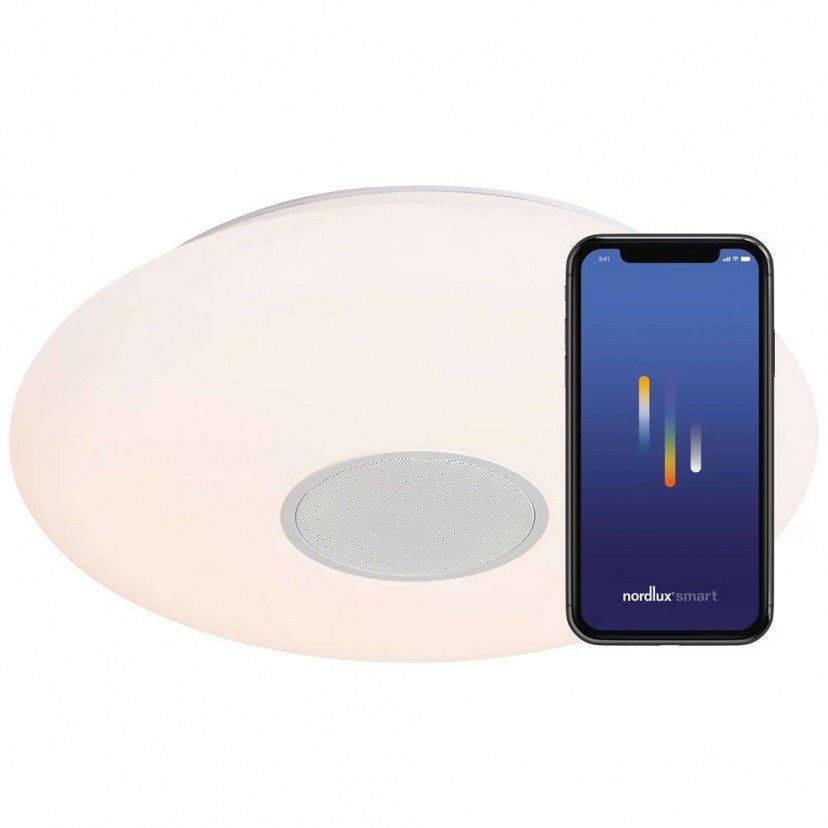 With the Ceiling Light - Ceiling Light With Smart Speaker Djay Smart 2110886101 you can enjoy a nice shower, accompanied by the perfect atmosphere and your favorite music. Through the Nordlux Smart app you can adjust the light from cool to warm white and choose between millions of colors, while you can also control its built-in bluetooth speaker. It has a built-in memory function. The IP54 waterproof rating is suitable for wet areas such as the bathroom, but is also perfect for the living room or bedroom. It has integrated 21W LED lighting with adjustable white light (2700-6500) and a brightness output of 2200 lumens. Lifespan: 25000 hours. A five-year warranty is offered. Dimmable. Quality: