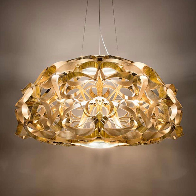 The Quantica Ceiling Light is a work of art inspired by the concept of "quantum entanglement," a concept that represents the cosmic interconnection of elements. This light creates a unique dance of light and shadow as it interacts with the luxurious sculpture it creates. The design of this light has been applied to the almost weightless, unbreakable Opalflex technopolymer, which is cut cold and then handmade, highlighting the golden result. The Quantica light is a valuable addition to both private and professional spaces, creating an impressive environment that captures attention. The design of this light comes from the hand of Adriano Rachele, who created a work of art that combines aesthetics and innovation in a unique way. It requires 4 E27 LED bulbs (with a maximum diameter of 6 cm) of 12W, which are not included in the packaging.