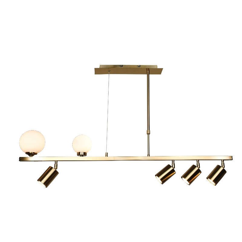 The Ceiling Rail Light 6191 features a combination of lighting, as it has two opal glass spheres that offer diffuse light and four metal spotlights that direct their light more specifically to certain areas. It has a metal frame that makes it sturdy and durable. It requires 4 GU10 bulbs and 2 G9 bulbs, which are not included in the package. The suspension height is adjustable. Quality: Metal & Glass. Dimensions: 1 Light: Length: 110 cm, Max Height: 70 cm.