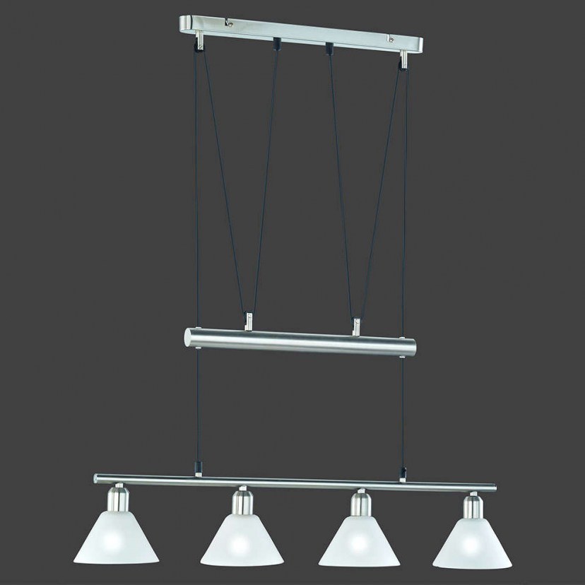 The Stamina Ceiling Light - Rail 3751041-07 is a four-light fixture, making it ideal for large spaces such as your living room, dining room, or office! It is a metal light with adjustable height. It has four glass lampshades that allow the light to diffuse gently into your space. It requires 4 E14 MAX 40W bulbs, which are not included in the package. Quality: Metal & Glass. Dimensions: 1 Light: Length: 80 cm, Height: 80-180 cm.