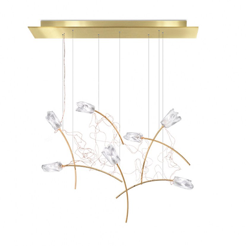 Imaginative, elegant, weightless... a unique sensation that will elevate the design of your space. The Tulip 7 Ceiling Light - Rail literally adorns spaces with floating flowers that have been hand-shaped according to Slamp's methods, making each one unique. The almost invisible cables hold the floating flowers that bloom from brushed brass stems. Each one is positioned at specific angles to create the sense of natural morphology. Each tulip is connected to the next through a series of intricate woven copper wires that carry low-voltage electrical energy. The LED light sources are included and can be replaced. It features 7 Dimmable LED bulbs of 5W with warm light at 2900 Kelvin and a luminous flux of 3500 Lumen. Quality: