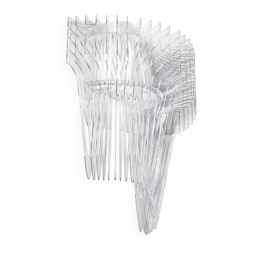 Zaha Hadid's luminous architecture is visionary, fluid, and dynamic, injecting the revolutionary and iconic semantics of the famous architect into residential and public interiors. The result is the harmonization of beings, objects, and lights in space. The Aria Applique Wall Light is a new creation by her with shaded black edges and ethereal transparent, polycarbonate versions that make this light fixture one of Hadid's masterpieces! It is made of specially processed materials with a patent from Slamp that best represent Hadid's design vision. It requires 2 E27 LED filament bulbs of 12W and 1 spot LED E14 bulb of 6W. It comes with a two-year warranty. Quality: