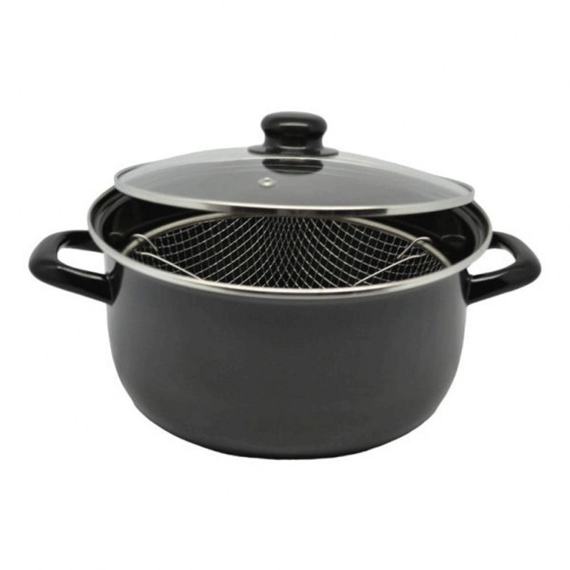 The Enamel Fryer E832118 is an extremely useful utensil for every kitchen. It is ideal for frying various foods. It has an enamel non-stick coating, a glass lid and a metal draining basket with two folding handles for ease of use. Quality: