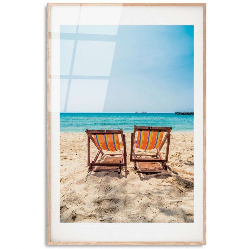 Frame 123BZM2543 depicts an image of two sunbeds on a sandy beach, offering a feeling of peace and relaxation. This exquisite piece of art brings out the vibrancy of colors and the beauty of nature, adding an air of freshness to your space. Made of tempered glass, this frame is not only aesthetically pleasing, but also durable. Printing on the back surface protects the colors from fading, ensuring they will stay vibrant and true for many years. Quality:
