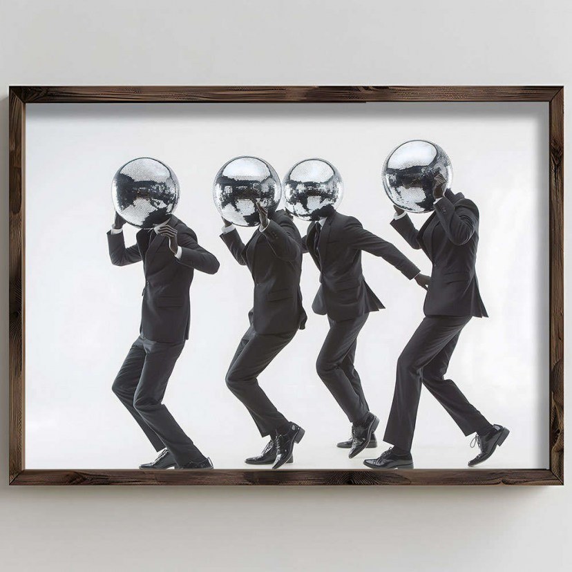 Frame 856EVL1607 uniquely captures 4 costumed human figures with disco ball heads. The design combines the creativity and playfulness of art with a funky, explosive atmosphere, inspiring a sense of fun and positive energy. Made of high quality materials, this frame is not only visually appealing but also durable and long lasting. Its frame, made of MDF and pine wood, guarantees that it will remain a beloved and durable element in your home for many years.