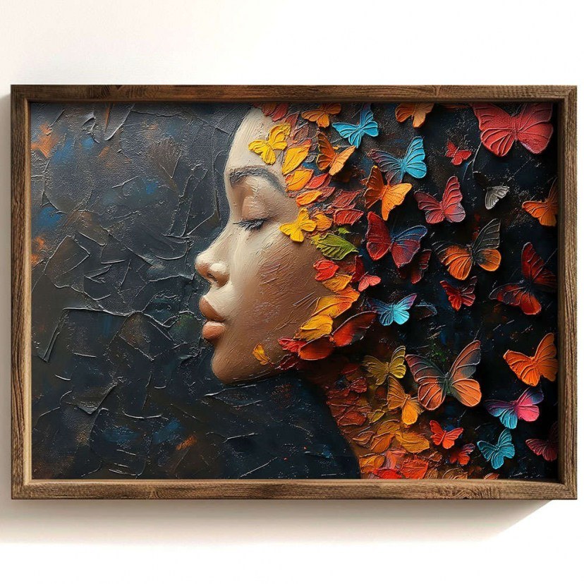 Bring elegance and vibrancy to your space with the 856EVL2378 Frame, which depicts a beautiful female figure with colorful butterflies in her hair. The design exudes a sense of freedom and natural beauty, while the bold butterflies add an enchanting and vibrant dimension to the image. It is made of MDF for exceptional durability and a refined finish and features a pine wood frame, giving it a warm and natural feel. UV printing offers vivid colors and high image quality, ensuring long-term durability and an impressive visual effect.