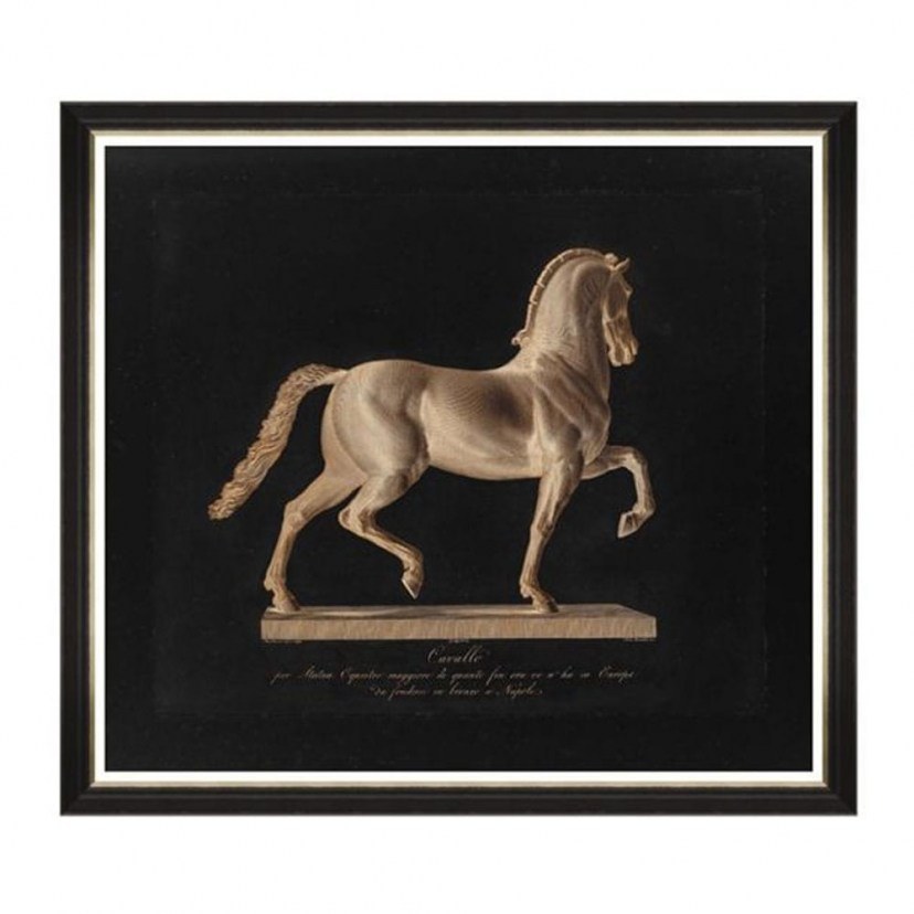 The Cavallo Nero By Marchetti FA13111 Frame depicts equestrian sculptures by Italian artist Dominico Marchetti. It is printed on lithographic paper and framed in a dark wooden frame. It features a special acrylic protective coating and has metal hardware for hanging. There may be a 3-5cm deviation in the stated dimensions due to the uniqueness of the product. Quality: Wood & Acrylic glass & Paper & MDF. Dimensions: 1 Frame: Length: 90 cm, Height: 80 cm.