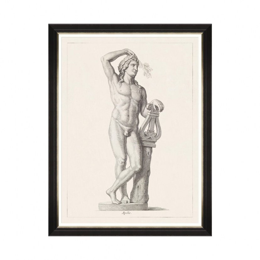 Aristocratic, antique frame depicting the Ancient Greek god of light and music, Apollo. The 'Greek Godess And Gods - Apollo FA13114' frame features a wooden frame with an antique finish and special protective glass to showcase the beautiful god in the best way possible. There may be a 3-5cm deviation in the dimensions due to the uniqueness of the product. Quality: Wood & Foat glass & Paper & MDF. Dimensions: 1 Frame: Length: 60 cm, Height: 80 cm.