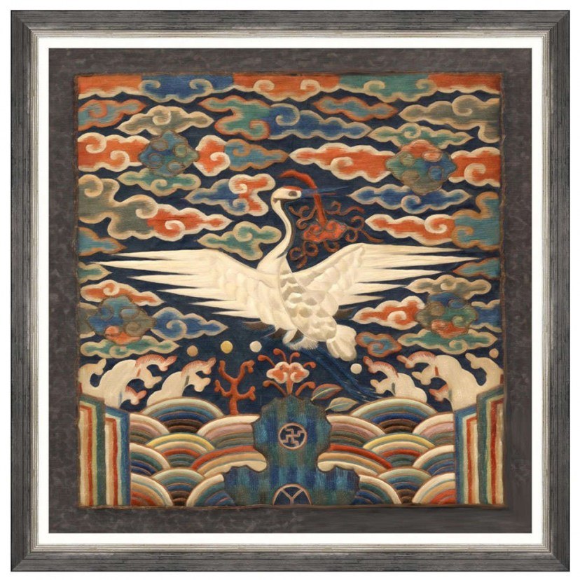 This printed artwork made of linen depicts a crane flying high through clouds of vibrant colors in a deep blue sky, with fantastic details and ornaments that create a peculiar and dreamlike piece of art. The Korean FA13419 frame is presented in a vintage black wooden frame and decorated with a white slip. It features special protective glass and metal fittings for hanging. There may be a 3-5cm variation in the mentioned dimensions due to the uniqueness of the product. The latex inks used are certified to comply with the Nordic Swan Environmental Standard. The inks are odorless, highly durable, and all waste is responsibly disposed of.