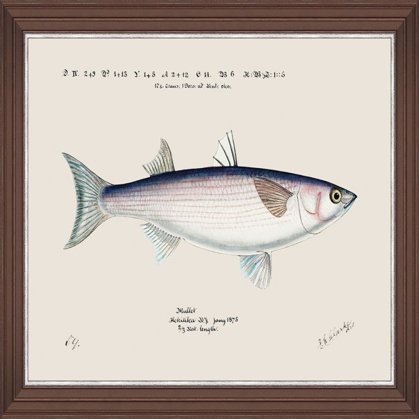 The 'Kadro' Mediterranean Fish - Grey Mullet By F Clark Fa13376 is part of a collection of six paintings that depict different species of fish designed with soft shades and thin lines, with additional handwritten notes for a more scientific appearance. It is printed on lithographic paper and comes with an antique frame. There may be a deviation of 3-5cm in the specified dimensions due to the uniqueness of the product. The product is imported exclusively for you from abroad, so there may be delays in delivery time. Quality: Wood & Acrylic glass & Paper & MDF. Dimensions: 1 Painting: Length: 50 cm, Height: 35 cm.